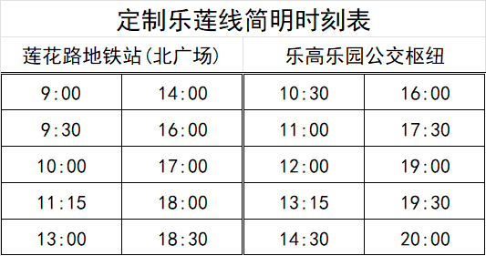 首末班时间:莲花路地铁站(北广场)9:00-18:30,乐高乐园公交枢纽 10:30-20:00。