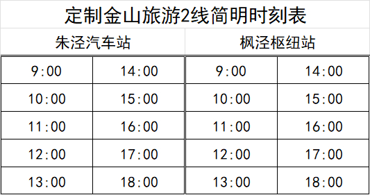首末班时间:朱泾汽车站9:00-18:00,枫泾枢纽站9:00-18:00。