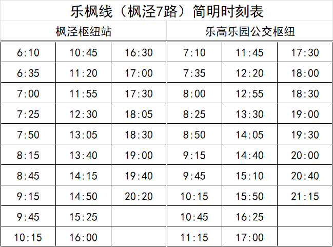 首末班时间:乐高乐园公交枢纽7:10-21:15,枫泾枢纽站6:10-20:20。