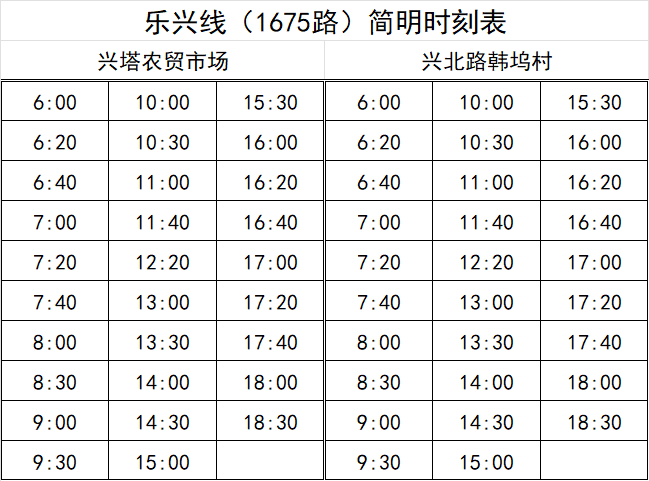 首末班时间:兴塔农贸市场6:00-18:30,韩坞村 6:00-18:30。