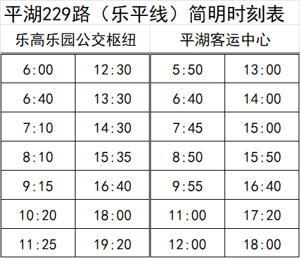 首末班时间:平湖客运中心5:50-18:00,乐高乐园公交枢纽6:00-19:20。