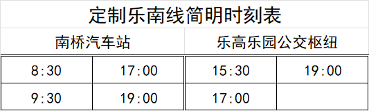 首末班时间:乐高乐园公交枢纽15:30-19:00,南桥汽车站8:30-19:00。