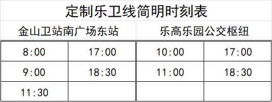首末班时间:乐高乐园公交枢纽10:00-18:30,金山卫站8:00-18:30。