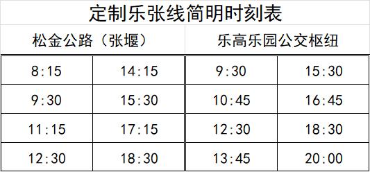 首末班时间:松金公路张堰 8:15-18:30,乐高乐园公交枢纽 9:30-20:00。