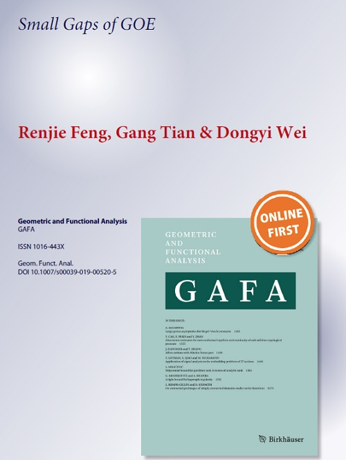 2019年,冯仁杰博士、博士后韦东奕与田刚院士合作的论文“Small gaps of GOE”获世界顶级数学期刊Geometric and Functional Analysis(GAFA)接受并在线发表。(图/北京国际数学研究中心)