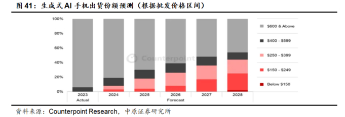 预计从2025年起,AI手机将从高端机型逐渐普及至中端机型,反映出端侧生成式AI作为更普适性的先进技术渗透整体手机市场的趋势。Counterpoint Research预计高端智能手机市场(批发价高于600美元)将在2024年和 2025年推动生成式AI智能手机出货量,占总出货量约80%。到2026-2027年,生成式AI的采用将分别扩展到高端(400-599美元)和中高端(250-399美元)市场,预计这些市场将占生成式AI出货量的30%左右。硬件和软件的进步正在使生成式AI普及,到2027-2028年,可能会推动250美元以下智能手机采用生成式AI。