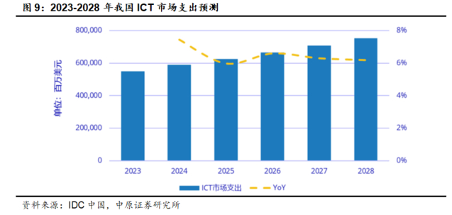 IDC预测2028年我国ICT市场规模接近7517.6亿美元,五年复合增长率(CAGR)为6.5%。其中,消费端在政策刺激与新兴技术产品推动下迎来复苏,智能终端需求有所增长。企业视角下,2024年我国企业级ICT市场规模约为2693.6亿美元,同比增长11.7%,高于GDP增速。自2024年起我国企业级ICT市场以每年11.5%的复合增长率增长,2028年我国企业级ICT市场规模接近4150亿美元。出海、云计算、AI及算力部署成为市场增长核心引擎。