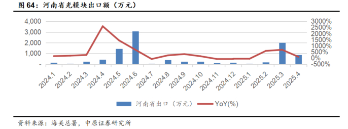 2025年4月,河南省单月光模块出口额为887.63万元,同比增长100.6%,环比下降55.9%。2025年1-4月,河南省光模块出口总额为3152.61万元,同比增长256.50%。