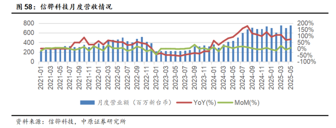 信骅科技(ASPEED)是全球服务器BMC(基板管理控制器)芯片的龙头厂商,2024年,公司在全球服务器远端管理芯片市场的份额维持在70%左右,服务器BMC业务占公司营收比重超90%。公司在全球服务器管理芯片市场处于主导地位,收入结构清晰,经营数据月度披露,由于每台服务器主机板至少配备一片BMC控制芯片,公司营收数据可作为全球云厂商资本开支和服务器行业景气度的前瞻指标,能够提前2-3个月体现服务器市场景气度的变化。2025年5月,信骅科技实现营收7.60亿新台币,同比增长74.5%,环比增长7.9%。2025年1-5月,信骅科技累计实现营收35.29亿新台币,同比增长89.3%。