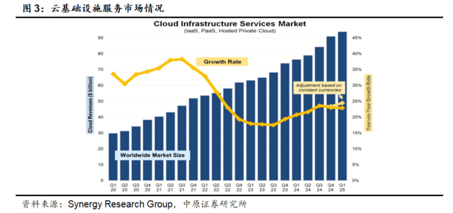 Synergy Research Group的数据显示,2025Q1全球企业在云基础设施服务上的支出为940亿美元,同比增长23%。2025Q1亚马逊、微软和谷歌的全球市场份额分别为29%、22%和12%。