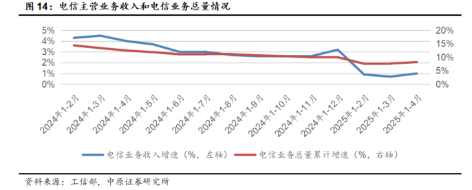 2025年1-4月,电信业务量收增速小幅回升,移动互联网接入流量保持较快增长,5G、千兆光网、物联网等新型信息基础设施建设稳步推进;电信业务收入累计完成5985亿元,同比增长1.0%,电信业务总量同比增长8.2%(按上年不变价计算),增速较2025Q1回升0.5pct。