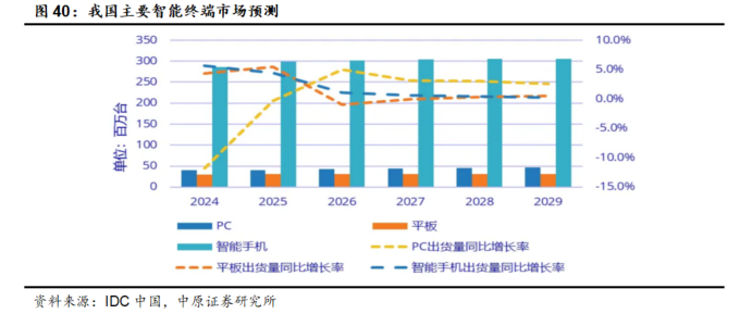 DeepSeek推出后,其对于终端市场规模的影响将逐渐在2-5年间起到显著的带动作用。我国市场上,IDC预计PC、平板和智能手机出货量未来五年复合增长率将分别实现2.6%,1.0%和1.3%。随着华为、联想、荣耀、OPPO、vivo等终端厂商陆续接入DeepSeek,其终端设备的智能化水平将通过自然语言处理和多模态推理能力,实现更流畅的语音交互和更智能的自动化控制,并加速AI终端应用落地。DeepSeek有利于端侧部署底层模型统一化,通过提升兼容性推动端侧AI生态建设。DeepSeek以其轻量化优势,更好的适配终端设备,降低了模型的存储和计算需求,为终端设备的底层模型统一化提供更多可能。DeepSeek通过模型优化、软硬协同、跨平台适配等技术手段,显著提升终端设备端侧部署的兼容性,加上其轻量化版本能够适配从低端到高端芯片的多种硬件,进一步推动端侧AI的生态建设。
