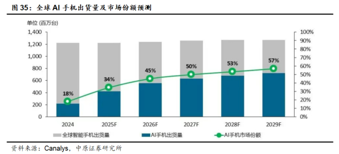 从技术趋势来看,功能的迭代升级及AI赋能技术创新的加持,后续AI手机市场渗透空间有望进一步提升。Canalys预计2025年AI手机渗透率将达到34%,端侧模型的精简以及芯片算力的升级将进一步助推AI手机向中端价位段渗透。2025年芯片厂商发布的新款次旗舰SoC,如骁龙8s Gen4、天玑 9400e已具备流畅运行端侧大模型的能力,DeepSeek的出现在很大程度上降低大模型对于芯片算力的开销。在这两大因素的共同作用下,2025-2026年AI手机预计会保持高速渗透的趋势。