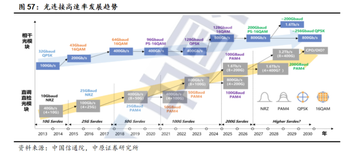 高速率光模块迭代周期缩短。数据/智算中心内部网络架构趋向扁平化,连接密度及交换容量大幅增长。在数据流量激增和网络架构演进双重驱动下,光连接技术向高速率、大容量、高可靠、低能耗、低时延、智能化等方向发展演进,其中高速率是最核心发展诉求。当前,数据/智算中心互联已成为最主要应用场景,市场规模约为电信网络的1.5-2倍,早期为3-4年更新一代,AI影响下迭代周期将进一步缩短。
