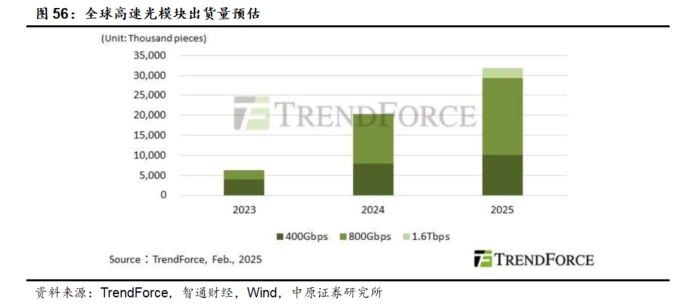 AI服务器的需求持续推升800G/1.6T光模块的增长动力。TrendForce预计2025年400G以上的光模块全球出货量将超过3,190万个,年增长率达56.5%。DeepSeek模型虽降低AI训练成本,但AI模型的低成本化有望扩大应用场景,进而增加全球数据中心建设数量。光模块作为数据中心互连的关键组件,将受益于高速数据传输的需求。未来AI服务器之间的数据传输,仍需大量的高速光模块。DeepSeek与CSP、AI软件厂商将共同推动AI应用普及。未来大量的数据将在边缘端生成,因此工厂、无线基地台等场地需建设大量微型数据中心,并通过密集部署光模块,预期将使每座工厂的光通信节点数量较传统架构增加3-5倍。相较于传统的电信号传输,光纤通信具有更高的频宽、更低的延迟和更低的信号衰减,能够满足AI服务器对高效能数据传输的严苛要求,这使得光通信技术成为AI服务器不可或缺的关键环节。AI服务器的需求持续推升800G/1.6T光模块的增长动力。传统服务器也随着规格升级,带动400G光模块的需求。