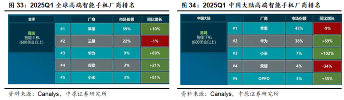 高端手机市场需求维持韧性。2025Q1全球600美元以上价位段出货量同比增长12%,厂商对于高端化的坚持投入以及AI手机的发展进一步推动高端市场成长。
