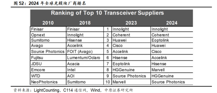 LightCounting最新发布的2024年全球光模块TOP10榜单显示,中国厂商已在该领域占据主导地位(占7席)。旭创科技(排名第1)和新易盛(排名第3)将其业务重点聚焦于服务北美云公司,专注于高速以太网光模块这一增长最快的细分市场,2024年均实现创纪录的盈利水平。华为排名第4,光迅科技、海信宽带、华工正源分列第6至9位,索尔思光电位居第10。这一格局充分展现中国厂商在全球光模块市场的主导地位。