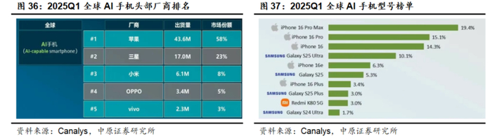 2)三星在Q1发布了其新旗舰产品S25系列,但初期表现并没能够复现其初代AI手机S24系列的成功,出货同比下跌1%,位居第二。