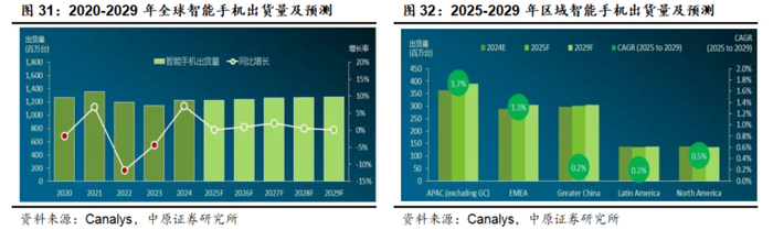 根据Canalys的测算,2025Q1,全球智能手机市场同比增长0.2%。2025年初市场遭遇宏观经济、地缘政治等不确定性,使得消费情绪更加保守。此外,在经历2024年末的节庆旺季后,厂商优化库存水位,减缓出货流速。2025年全球智能手机出货量预计为12.2亿台,同比增长0.1%,2025-2029年市场预计以1%的年复合增长率温和增长。