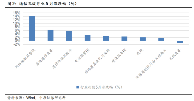 2025年5月(2025.05.01-2025.05.31)通信行业各子板块涨多跌少。三级行业中,网络接配及塔设、其他通信设备、通信终端及配件分别上涨14.4%、6.3%、5.5%。