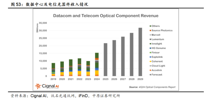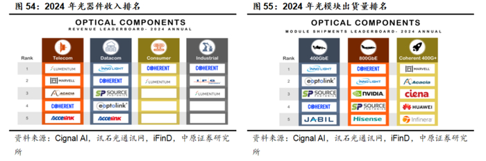 根据Cignal AI的测算,2025年数据中心光器件市场将增长60%以上,收入超过160亿美元,主要得益于400G和800G产品的持续放量。中际旭创、Coherent和新易盛是数据中心模块的主要供应商,Coherent、Broadcom和Lumentum是关键光器件的核心来源。尽管1.6T数据中心光模块将于2025年启动过渡,但在2026年前不会影响400/800G技术的增长率。电信器件收入将在2025年反弹,400ZR相干模块的持续增长与最新一代WSS模块及放大器销售加速形成合力。2024年Lumentum领跑电信器件收入榜,Marvell和Acacia等400ZR供应商紧随其后。