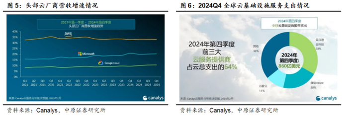2024年,全球云基础设施服务支出同比增长20%,达到3213亿美元。2024H2,主要云厂商报告AI投资带来的显著回报,AI应用对整体云业务的推动作用日益凸显。云计算巨头正加大云和AI基础设施投资力度,以满足日益增长的需求。Canalys预测2025年全球云基础设施服务支出将达到19%。