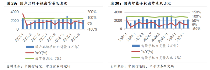 2025年1-4月国内5G手机出货量同比增长5.6%。2025年1-4月,国内市场手机出货量为9470.8万部,同比增长3.5%;5G手机出货量为8093.2万部,同比增长5.6%,占同期手机出货量的85.5%;国产品牌手机出货量为8226.2万部,同比增长7.8%,占同期手机出货量的86.9%;国内智能手机出货量8683.6万部,同比增长0.5%,占同期手机出货量的91.7%。Canalys预计2025年AI手机渗透率将达到34%,端侧模型的精简以及芯片算力的升级将进一步助推AI手机向中端价位段渗透。