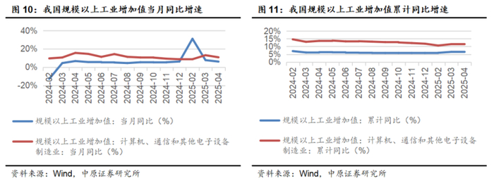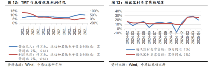 2025年1-4月,我国规模以上工业增加值同比增长6.4%,TMT工业增加值同比增长11.3%,TMT行业营收同比增长10.1%,利润总额同比增长11.6%。TMT工业增加值增速高于工业增加值整体增速,彰显新质生产力的推动作用。