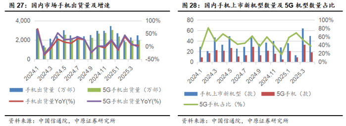 上市新机型方面,2025年4月,国内手机上市新机型50款,其中5G手机19款,占同期手机上市新机型数量的38.0%。2025年1-4月,国内手机上市新机型163款,其中5G手机82款,占同期手机上市新机型数量的50.3%。