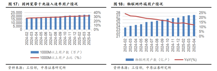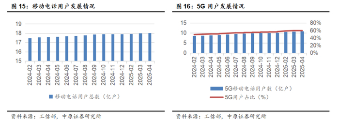 5G网络建设有序推进。截至2025年4月,5G基站总数达443.9万个,比2024年末净增18.8万个,占移动基站总数的34.9%,占比较2024年末提高1.3pct。5G基站建设预计保持平稳增长。