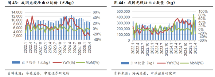2025年4月,我国光模块出口总额为32.8亿元,同比下降14.8%,环比下降23.9%;光模块出口均价为9161.15元/kg,同比下降25.0%,环比下降3.1%;光模块出口总量为357,968kg,同比增长13.5%,环比下降21.5%。2025年1-4月,我国光模块出口总额为132.0亿元,同比下降1.2%。
