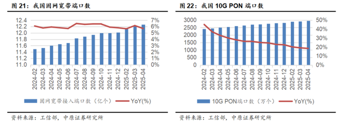 千兆光纤宽带网络建设持续推进。截至2025年4月,全国互联网宽带接入端口数量达12.26亿个,比2024年末净增2380万个。其中,光纤接入(FTTH/O)端口达到11.8亿个,比2024年末净增2352万个,占互联网宽带接入端口的96.6%;具备千兆网络服务能力的10G PON端口数达2960万个,同比增长18.45%。