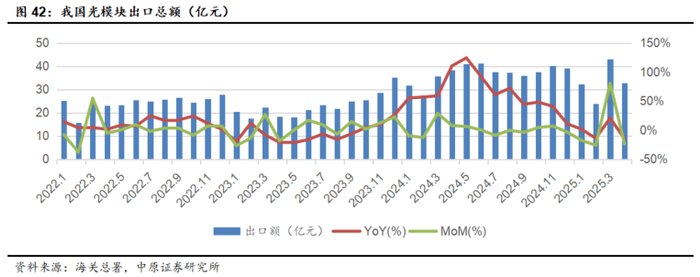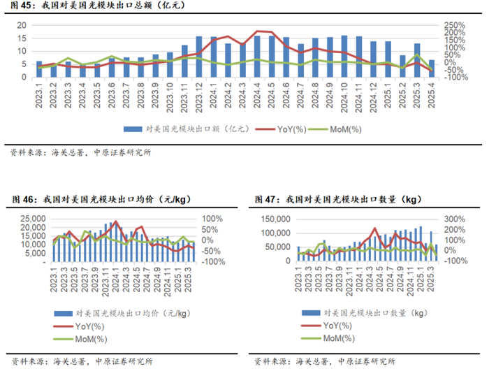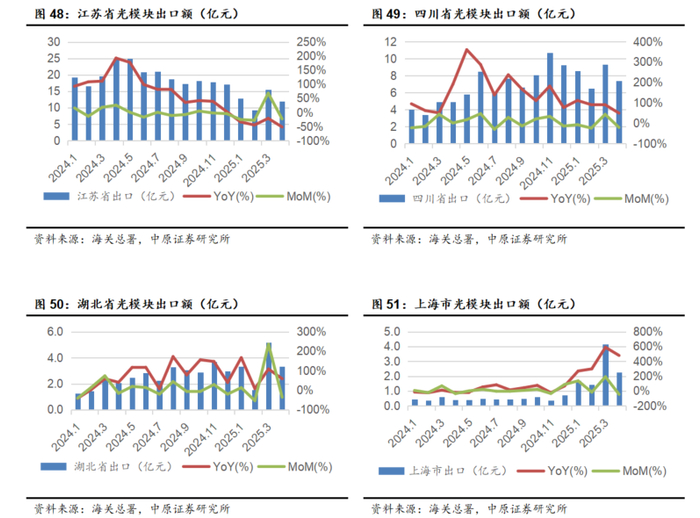 2025年1-4月,上海、四川、湖北光模块出口额同比增速较高。从省份出口数据来看, 2025年1-4月,江苏省出口额为15.58亿元,同比下降38.2%;四川省出口额为31.73亿元,同比增长83.7%;湖北省出口额为13.41亿元,同比增长84.6%;上海市出口额为9.52亿元,同比增长427.2%。