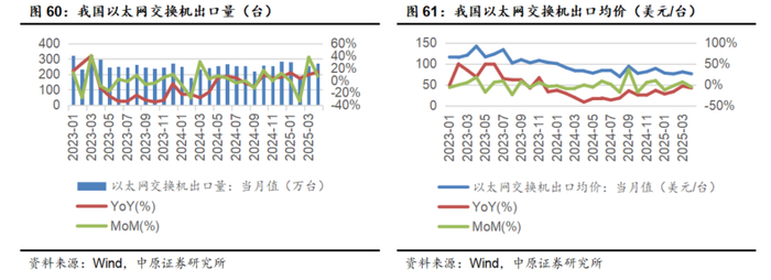 2025年4月,我国以太网交换机出口额为2.06亿美元,同比上升4.6%,环比上升0.8%;以太网交换机出口数量为271.9万台,同比增长13.6%,环比上升6.9%;以太网交换机出口均价为75.93美元/台,同比下降8.0%,环比上下降5.6%。以太网交换机出口数量连续7个月同比实现正增长,出口均价同比降幅收窄,出口额小幅增长,市场有望迎来拐点。