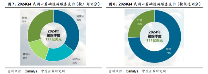 根据Canalys的数据,2024Q4,我国云基础设施服务支出达到111亿美元,同比增长14%。2024年全年,云服务总支出为400亿美元,同比增长13%。AI模型的快速应用带动对云服务需求的显著增长。2024Q4,我国前三大云服务提供商(阿里云、华为云和腾讯云)保持市场领先地位,三者合计占据云基础设施服务市场71%的份额。随着对AI产品需求的提高,市场集中度持续上升,领先厂商凭借其在算力资源和基础设施部署方面的优势,巩固主导地位。 Canalys预计2025年我国云基础设施服务市场的增速将达到15%。