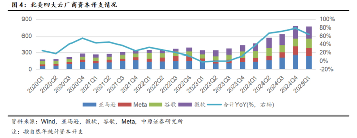 亚马逊、微软、谷歌、Meta均在2025年大幅加码资本开支,合计指引投入超3000亿美元。2025Q1,北美四大云厂商资本开支合计为765亿美元,同比增长64%。