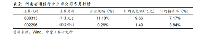 2025年5月,沪深两市河南通信行业有2家上市公司,其中,仕佳光子上涨11.10%,辉煌科技上涨0.29%。