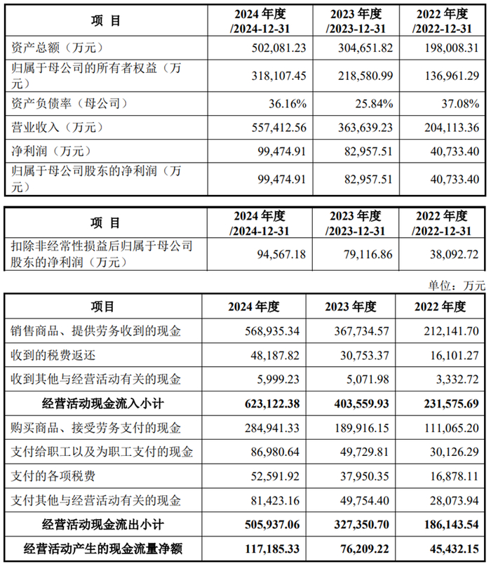 2022年至2024年,影石创新的公司营业收入分别为204,113.36万元、363,639.23万元和557,412.56万元;净利润/归属于母公司所有者的净利润分别为40,733.40万元、82,957.51万元和99,474.91万元;扣除非经常性损益后归属于母公司股东的净利润分别为38,092.72万元、79,116.86万元和94,567.18万元。