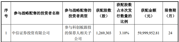 影石创新本次发行中,初始战略配售发行数量为8,200,000股,占本次发行数量20.00%。最终战略配售数量为8,200,000股,占本次发行数量20.00%。本次发行的保荐人(联席主承销商)中信证券按照相关规定参与本次发行的战略配售,跟投主体为中证投资。中证投资本次获配股数为1,269,303股,跟投比例为本次公开发行数量的3.10%,获配金额为59,999,952.81元。