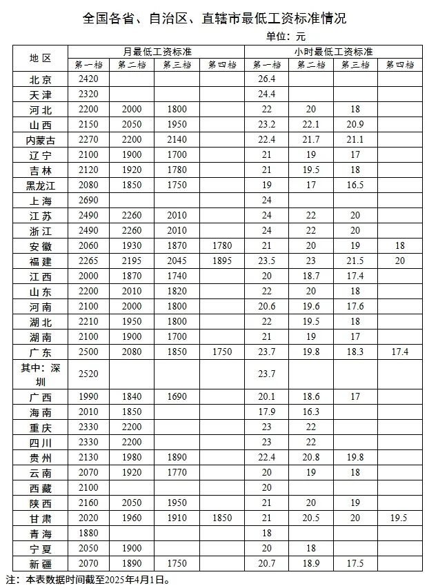 广东从2025年3月1日起调整提高该省全日制就业劳动者月最低工资标准和非全日制小时最低工资标准。广州、深圳执行一类标准,广州市调整为2500元/月,深圳市调整为2520元/月,两市对应的非全日制小时最低工资标准均为23.7元/小时。