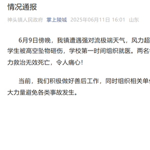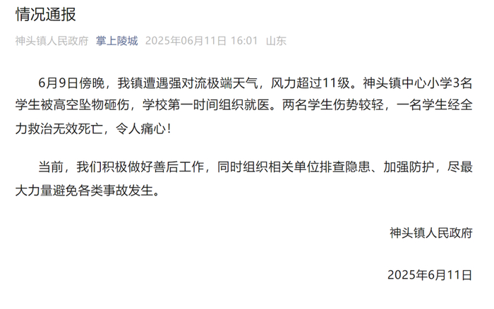 6月9日傍晚,我镇遭遇强对流极端天气,风力超过11级。神头镇中心小学3名学生被高空坠物砸伤,学校第一时间组织就医。两名学生伤势较轻,一名学生经全力救治无效死亡,令人痛心!