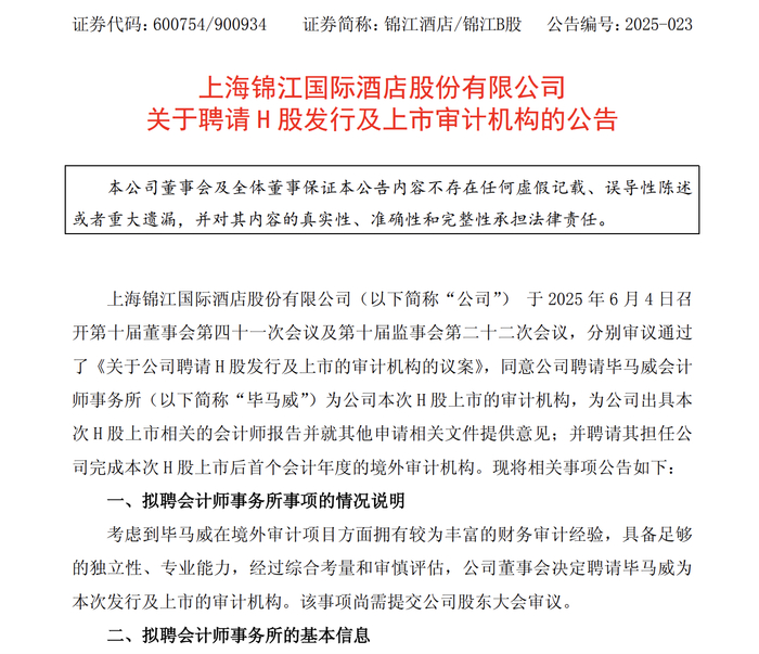 6月4日晚间,锦江酒店(股票代码:600754.SH)公告透露,为深入推进公司的全球化战略,加强与境外资本市场对接,拟于境外发行股份(H股)并在香港联交所上市,拟聘请毕马威为审计机构。