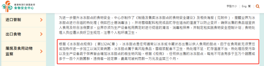 根据香港《冰冻甜点规例》,任何供出售的冰冻甜点,每克不可含有多于100个大肠菌群或多于50000个细菌。违法者一经定罪,最高可处罚款一万港元及监禁三个月。