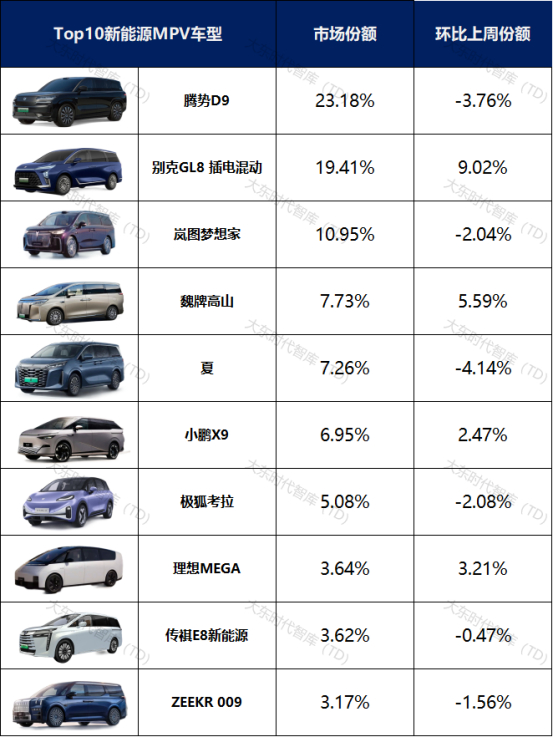 CR3、CR5和CR10分别为53.54%、68.54%和91.00%。腾势D9 以23.18%的市场份额占据榜首,大幅领先其他车型。别克GL8 插电混动以19.41%的市占率超越夏和岚图梦想家,跃居榜单第二,环比上升9.02%。本月新上榜的车型有魏牌高山与理想MEGA,其中魏牌高山市占率达7.73%,环比上升5.59%;理想MEGA占比3.64%,环比上升3.21%。