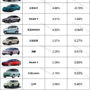CR3、CR5和CR10分别为16.70%、25.70%和36.90%。吉利汽车旗下的星愿和比亚迪旗下的海鸥分别蝉联月度销售冠亚军,其中星愿本月占比达6.55%,环比增加0.11%;海鸥虽环比下滑0.93%,但凭借5.27%的市占率依旧占领榜单第二。而吉利汽车旗下的另一款车型熊猫则遗憾落榜,本月占比仅2.04%,环比下滑0.30%