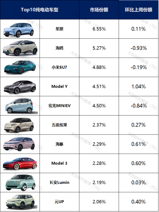 在5月新能源乘用车市场中,纯电动车型依旧稳居新能源汽车榜首,市占率高达60.03%。排名前十的纯电乘用车车型分别为星愿、海鸥、小米SU7、Model Y、宏光MINIEV、五菱缤果、海豚、Model 3、长安Lumin、元UP。