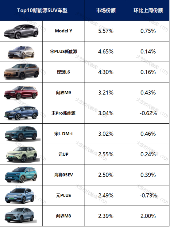 在5月(统计范围为第18-22周即4.28-6.01日)新能源乘用车市场中,SUV车型占比48.61%。其中销量排名前十的车型分别为Model Y、宋PLUS新能源、理想L6、问界M9、宋Pro新能源、宋L DM-i、元UP、海狮05EV、元PLUS、问界M8