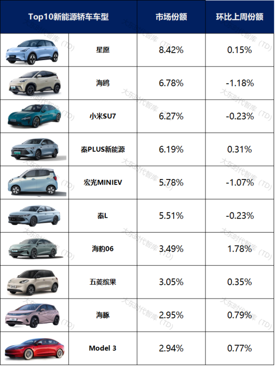在5月新能源乘用车市场中,轿车车型占比46.68%。其中销量排名前十的轿车车型分别为星愿、海鸥、小米SU7、秦PLUS新能源、宏光MINIEV、秦L、海豹06、五菱缤果、海豚、Model 3。