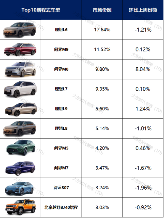 在5月新能源乘用车市场中,增程式车型占比为11.84%,环比增加1.80%。其中排名前十的增程式车型分别为理想L6、问界M9、问界M8、理想L7、理想L9、理想L8、问界M5、问界M7、深蓝S07、北京越野BJ40增程。