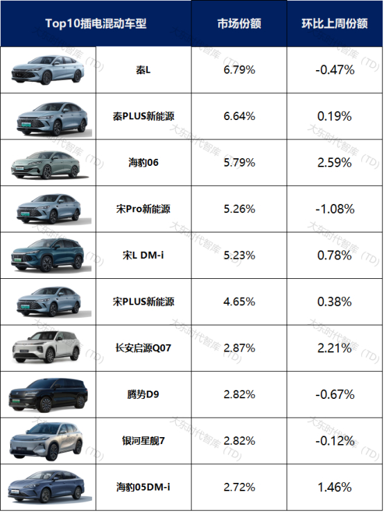 在5月新能源乘用车市场中,插电混动车型占比为28.13%。排名前十的插混乘用车车型分别为秦L、秦PLUS新能源、海豹06、宋Pro新能源、宋L DM-i、宋PLUS新能源、长安启源Q07、腾势D9、银河星舰7、海豹05DM-i。